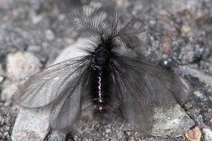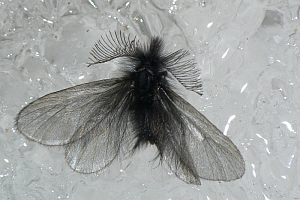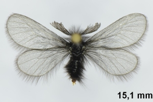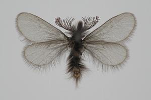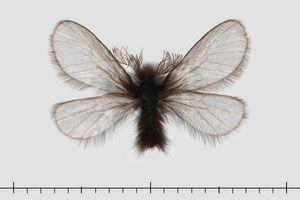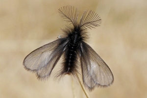 Unterscheidung von Ptilocephala muscella und P. plumifera: Die 5. und 6. Ader aus der Diskoidalzelle des Vorderflügels (vom Innerand aus gezählt) sind an der Basis bei plumifera verwachsen ("gestielt"), bei muscella getrennt (Hinweis von Erwin Hauser)