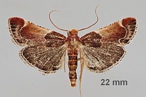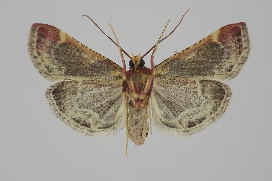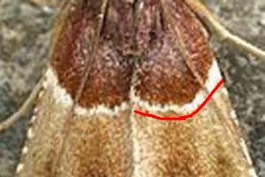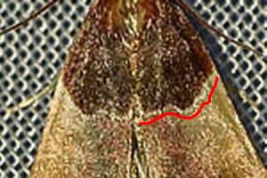 Pyralis liengialis und Pyralis farinalis unterscheiden sich im Verlauf der inneren Querlinie. Visualisierung Andrey Ponomarev im [Forum] (rote Linie redaktionell verstärkt).