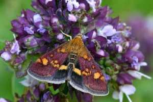 Auch bezüglich der Nennungen von Thymus besteht eine grundsätzliche Unsicherheit wegen der Verwechslungsmöglichkeit mit Pyrausta ostrinalis. Nach Heckford & Beavan (2021) akzeptiert Buszko (2020: 38-40) neben Dost und Minzen-Arten auch Thymus pulegioides als Nahrungspflanze von P. aurata. Falls das stimmt, spielt der Feld-Thymian sicher nur eine unbedeutende Rolle als Raupennahrungspflanze der Art.