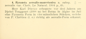 Leraut (2012: 212) hat zu Pyrausta aerealis einen knappen Kommentar: "Comment: This species replaced in Algeria by Pyrausta mauretanica Rebel, 1907, bona sp., stat rev., much lighter and with genitalia clearly different." Er benennt diese Unterschiede allerdings nicht und zeigt auch von keiner der beiden Taxa männliche oder weibliche Genitalien. Und er schreibt auch nichts über die Variationsbreite von P. aerealis in ihrem riesigen, ostwärts bis China reichenden Verbreitungsgebiet.