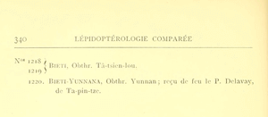 - Erstbeschreibung: Oberthür, C. (1886): Espèces nouvelles de lepidoptères du Thibet. — Études d'entomologie 11: [V]-XII, 13-38, pl. I-VII.