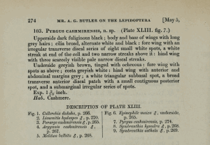 - Erstbeschreibung: Moore, F. (1874): List of Diurnal Lepidoptera collected in Cashmere Territory by Capt. R. B. Reed, 12th Regt., with Descriptions of new Species. — Proceedings of the Scientific Meetings of the Zoological Society of London for the Year 1874: 264-274, pl. XLIII. London (Taylor and Francis).