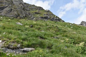 - [Cistaceae:] Helianthemum nummularium ssp. grandiflorum ?? [= Helianthemum grandiflorum ??] (Großblütiges Gewöhnliches Sonnenröschen, Großblüten-Sonnenröschen ??)