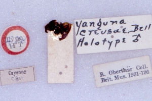 Bell (1931: 234): “Holotype male, Cayenne, Guyanne Française (C. Bar, R. Oberthür Coll., British Museum, 1931—136) ; allotype female, same data, in collection of the British Museum ; one male paratype, St. Laurent, French Guiana, in collection of the author.”