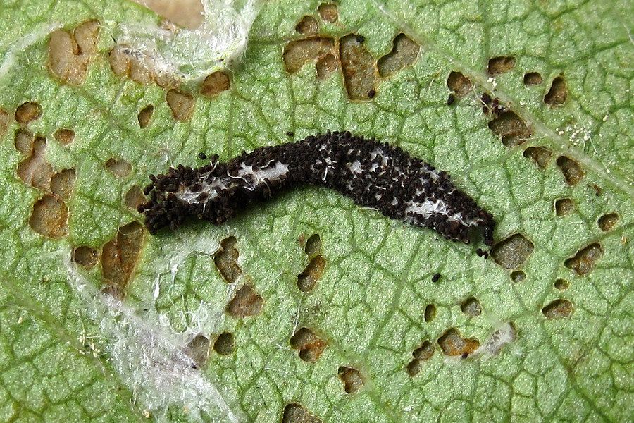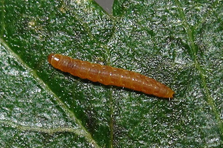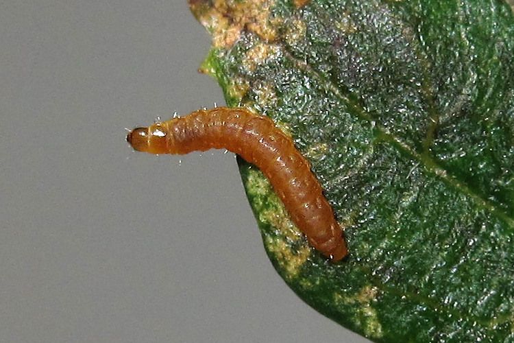 Schütze (1931: 99) führte die Art unter "Crataegus - Weißdorn, Hagedorn" an und zwar mit Hinweis "an Blättern". Er erläutert zur Raupe: "Zwischen filzig versponnenen Blättern von Crataegus, Pirus [Pyrus, Malus], Sorbus, Acer, Prunus spinosa usw. Verwandlung in der Wohnung oder zwischen Moos (Sorhagen); fast gesellig in zu einem großen Ballen versponnenen Sorbus-Blättern (Stange); zwischen versponnenen Trieben von Kern- und Steinobst (Disqué)." Schon zuvor hatte Schütze (1902: 19) zusammengetragen: "Gemein an Obstbäumen im Juni, Juli. Die Raupe lebt im Frühjahr auf Pyrus malus, Crataegus, Prunus spinosa, domestica, padus und Sorbus." Die phänologische Angabe zur Raupe umfasst dabei nur das letzte Raupenstadium im Frühjahr - tatsächlich schlüpft und frisst sie ja schon im Spätsommer und Herbst vor ihrer Überwinterung.