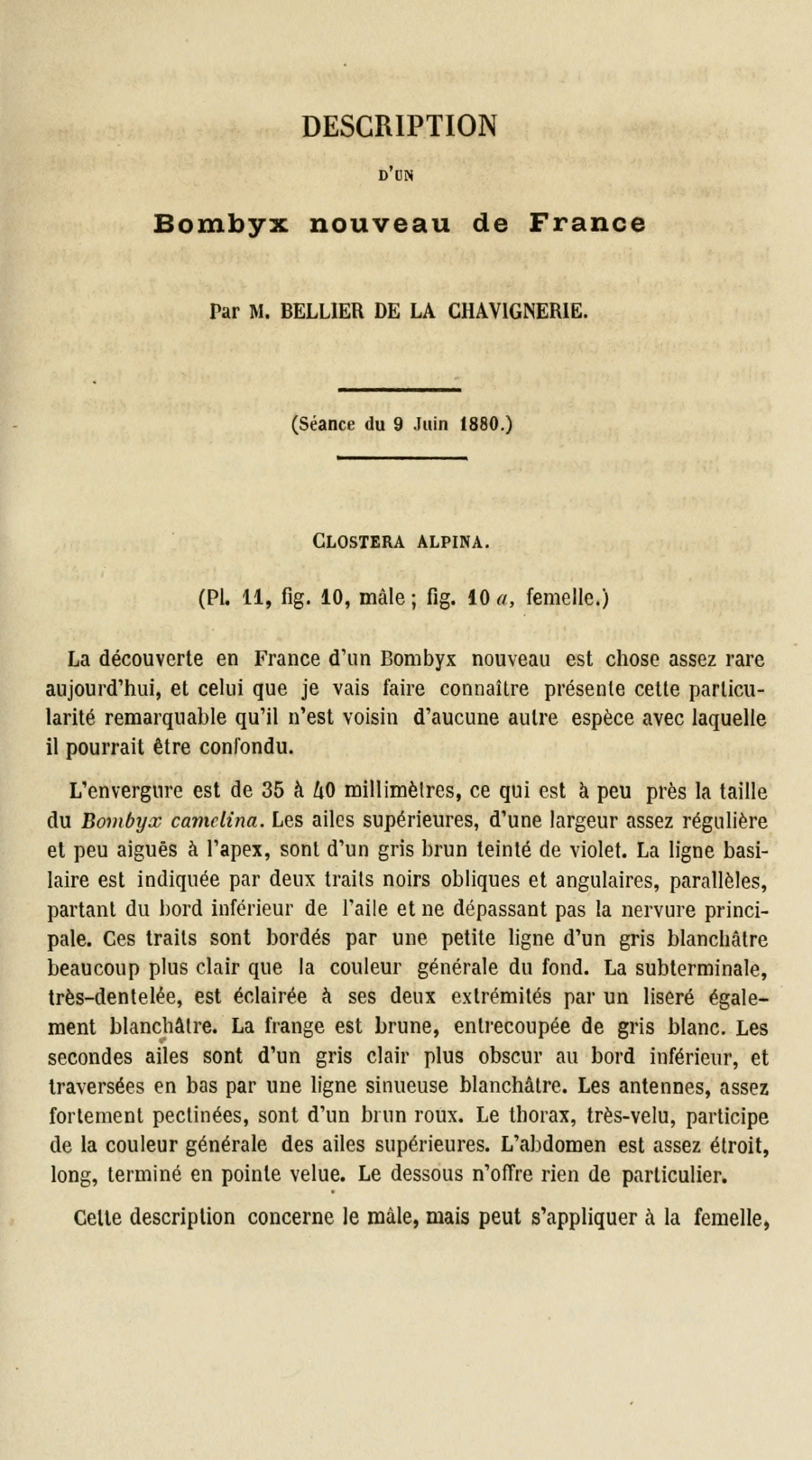 - Erstbeschreibung: Bellier de la Chavignerie (1880): Description d'un Bombyx nouveau de France. — Annales de la Société entomologique de France, 5e série 10: 367-368, pl. 11. Paris.