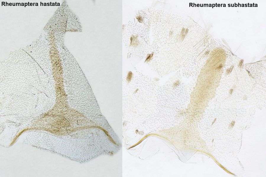 Achtung: Nach aktueller Meinung von [Alfred Haslberger] und auch der [AG Hess. Lepidopterologen vom Senckenberg-Museum] ist eine Unterscheidung von Rheumaptera hastata ohne Barcode oder Genitaluntersuchung unmöglich! Das heißt, dass die oft erwähnten Unterschiede in Zeichnung und Größe praktisch wertlos sind. Axel Hausmann meinte, man müsse Flügelzeichnung, Genital und DNA berücksichtigen. Alle 3 Merkmale hätten eine gewisse Variabilität. Außerdem sei der Biotop wichig. R. subhastata sei eine Art der Hochmoore [Forum]. Dementsprechend sind die hier auf dieser Seite gezeigten Falter, die nicht einem Barcoding oder einer Genitaluntersuchung unterzogen wurden, bis auf Weiteres zumindest als fraglich anzusehen.