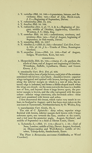 - Erstbeschreibung: Curtis, J. (1823-1840): British Entomology; Being Illustrations and Descriptions of the Genera of Insects Found in Great Britain and Ireland: Containing Coloured Figures from Nature of the Most Rare and Beautiful Species, and in Many Instances of the Plants upon which they are Found. Vol VI. Lepidoptera, Part II. — [Not paginated]. London (E. Ellis & Co.).