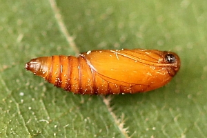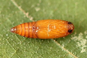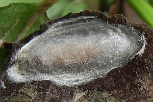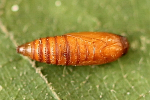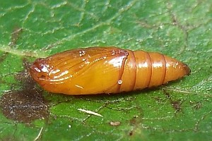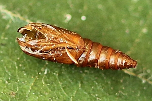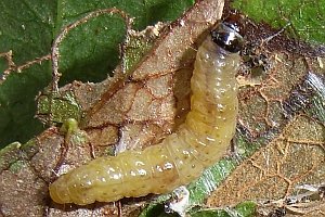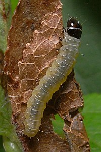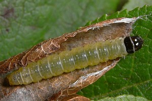Und von Heyden (1865: 101) berichtet im gleichen Jahr aus der Pfalz: "Raupe niedergedrückt, vorn und hinten verschmälert, glänzend, gelblich mit grau durchscheinenden Eingeweiden und kleinen, schwärzlichen, ein Härchen tragenden Warzen. Kopf wenig schmäler als das Nackenschild, herzförmig, glänzend, schwarzbraun. Nackenschild etwas schmäler als das folgende Segment, mit dunkler schwarzbraunem, durch eine feine Längslinie getheiltem, grossem, glänzendem Mondfleck. Afterklappe hinten gerundet, dunkel gerandet. Vorderbeine schwarz. Ich fand die Raupe in grosser Menge an Hecken von Berberis vulgaris bei Speyer. Sie spinnt mehrentheils die Blätter flach aufeinander und benagt sie sehr stark, wodurch die Hecken zum grossen Theil eine ganz braune Farbe hatten. Schon Mitte September verlässt die Raupe ihren Wohnort und spinnt sich unter einem feinen, eirunden, weissen Gespinnste zur Verpuppung ein. Der Wickler entwickelte sich im Zimmer Mitte April. (18G1.)"