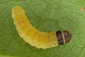 Kennel (1916: 491) schrieb: "Die Raupe ist weißlich mit blassen Punkten, Kopf und Nackenschild sind schwarz, die Analklappe ist blaß gelblich. Sie lebt im Juni an Berberis und Vaccinium myrtillus".
