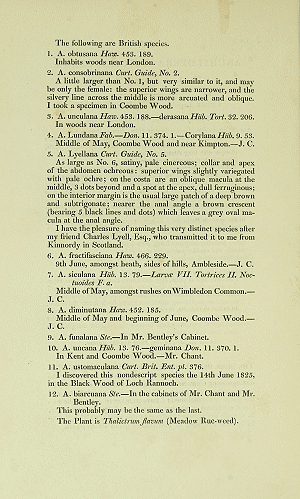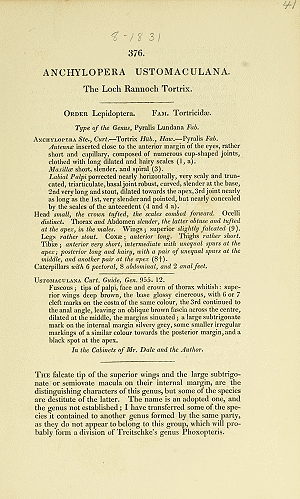 - Erstbeschreibung: Curtis, J. (1823-1840): British Entomology; Being Illustrations and Descriptions of the Genera of Insects Found in Great Britain and Ireland: Containing Coloured Figures from Nature of the Most Rare and Beautiful Species, and in Many Instances of the Plants upon which they are Found. Vol VI. Lepidoptera, Part II. — [Not paginated]. London (E. Ellis & Co.).