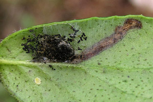 Im Hochmoor-Birken-Föhrenwald gibt die schmelzende Schneedecke den Blick auf die wintergrünen Preiselbeerbüsche (Vaccinium vitis-idaea) frei. Wo zwei Blättchen versponnen sind, das obere oft mehr oder weniger schwarz verfärbt, da überwintert die Raupe des Wicklers R. ustomaculana. Ganze Pflanze eintragen, weil die Raupen bei Zimmertemperatur noch einige Tage fressen wollen! Sind an Preiselbeere drei Blättchen in der Form eines Buchnüsschens versponnen, schlüpft dann eher Stictea mygindiana. Die Raupe von R. ustomaculana verpuppt sich in der Regel im Überwinterungsgehäuse, das sie im Frühjahr höchstens noch mit ein bis zwei weiteren versponnenen Blättchen vergrössert hat. Obwohl die Blattgehäuse im Frühling grösser sind als im Winter, sind sie kaum mehr zu finden, da die höher wachsenden Büsche von Heidel- und Moorbeere (Vaccinium myrtillus und Vaccinium uliginosum) jetzt Blätter tragen und die niedrigeren Preiselbeerbüsche überdecken. Die Falter leben sehr versteckt in den Vaccinium-Büschen und scheinen nur ungern ans Licht zu kommen. Ihre Flugzeit liegt in diesem jurassischen Hochmoor auf 1000 m in der zweiten Hälfte des Monats Juni.