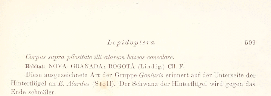 - Erstbeschreibung: Felder & Felder (1864-1867): Reise der österreichischen Fregatte Novara um die Erde in den Jahren 1857, 1858, 1859 unter den Befehlen des Commodore B. von Wüllerstorf-Urbair. Zoologischer Theil. Zweiter Band. Zweite Abtheilung: Lepidoptera. I-VI, 1-549. Wien (Kaiserlich-königliche Hof- und Staatsdruckerei). — Digitalisat auf biodiversitylibrary.org: [508]