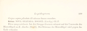 - Erstbeschreibung: Felder & Felder & A. F. Rogenhofer (1864-1867): Reise der österreichischen Fregatte Novara um die Erde in den Jahren 1857, 1858, 1859 unter den Befehlen des Commodore B. von Wüllerstorf-Urbair. Zoologischer Theil. Zweiter Band. Zweite Abtheilung: Lepidoptera. Atlas: 1-10 (Inhalts-Verzeichniss pl. I-LXXIV), 1-10 (Erklärung der Tafeln LXXV-CVII), 1-20 (Inhalts-Verzeichniss Tafeln CVIII-CXL), pl. I-CXL. — Digitalisat auf biodiversitylibrary.org: [pl. LXX figs. 11-12]