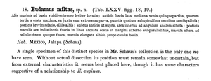 - Erstbeschreibung: Godman, F. D. & O. Salvin (1879-1901): Biologia Centrali-Americana. Insecta. Lepidoptera-Rhopalocera. Vol. III. (Plates.): pl. 1-24, 24a, 25-112. — Digitalisat auf biodiversitylibrary.org: [pl. 75 figs. 18-19]