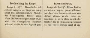 Schon Stainton (1864, S. 195) kannte die Raupe - ordnete sie aber fälschlicherweise Dialectica imperialella zu: „Auffinden der Raupe. Wenn man zu Anfang oder Mitte Juli in einem Gehölz, in dem diese Art vorkommt, die Blätter des Orobus niger besichtigt, so wird man vielleicht solche bemerken, die ein aufgeblasenes Ansehen haben, indem die weisse Haut der Unterseite abgelöst und zu Falten aufgedunsen ist, während die Oberseite des Blattes durch den Mangel eines guten Theils des Parenchyms gescheckt aussieht. Wenn man beim Oeffnen eines solchen Blattes eine zinnoberrothe Raupe findet, so hat man ohne Zweifel, die von Gracilaria Imperialella vor sich.“ Wie sich bald zeigen sollte, irrte er sich. „Gracilaria imperialella“, jetzt Dialectica imperialella lebt als Raupe an Boraginaceae; was er hier vor sich hatte, war eine bis dahin nicht beschriebene Art. In der drei Jahre später erfolgenden Erstbeschreibung der neuen Art durch Schleich (1867) wird klargestellt: „… Alles Uebrige ist von Stainton im 8. Bande seiner Nat. Hist. Vollkommen zutreffend angegeben. Auch die 14füssige an Orobus niger lebende Raupe, ihre Farbe, und ihre Art zu miniren hat Mr. Stainton ebendaselbst pag. 199-207 vollkommen naturgetreu beschrieben. Ich füge nur noch hinzu, dass das Thierchen hier bei Stettin schon Ende Juni seine Minirarbeit beginnt und damit schon gegen Mitte Juli fertig ist, so dass wir nach dem 15. Juli keine Raupe mehr in den Minen mehr antreffen konnten. Diese Gleichmässigkeit in der Entwicklung der Raupen ist der andern auf Symphyt. lebenden Art gegenüber sehr charakteristisch.“