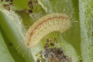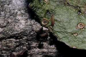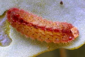 1: von Ameisen bewachte und 'eingestallte' Raupe, Deutschland, Sachsen, vic. Frankenberg, 260 m, 2. August 2011 (Manipuliertes Freilandfoto: Frank Herrmann), det. Frank HerrmannForum