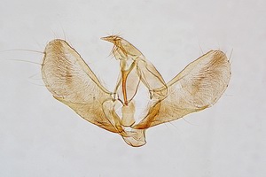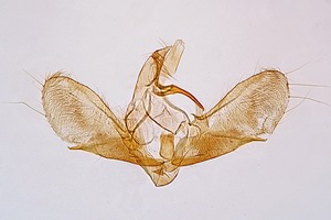 1: Genitalpräparat des oben abgebildeten männlichen Falterbelegs 1, Daten siehe dort, GP 1991-076 (präp., det. & Foto: Rudolf Bryner)Forum