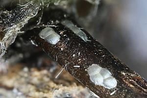 2: England, Devon, Paignton Zoo, Eiablage eines gefangenen Weibchens auf abgestorbene Teile von Spitzwegerich (Plantago lanceolata) 22. Juni 2012, Foto am 25. Juni 2012 (leg., det. & Foto: Robert J. Heckford & Stella D. Beavan)