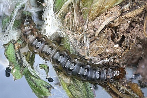 2: England, Devon, Paignton Zoo, Eiablage eines gefangenen Weibchens 22. Juni 2012, Foto der Raupe (2. Larvenstadium) am 21. Juli 2012 (leg., det. & Foto: Robert J. Heckford & Stella D. Beavan)