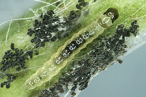 1: England, Devon, Paignton Zoo, Eiablage eines gefangenen Weibchens 22. Juni 2012, Foto der Eiraupe am 16. Juli 2012 (leg., det. & Foto: Robert J. Heckford & Stella D. Beavan)