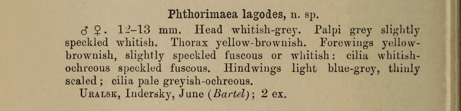 Mit dem Locus typicus "Uralsk, Indersky" (Уральск Индерский) in der Erstbeschreibung ist anscheinend der Inder District gemeint, der zwischen dem Ural und dem Kaspischen Meer beiderseits des Ural-Flusses liegt - also in Europa und Asien. In der Fauna Europaea ([http://fauna.naturkundemuseum-berlin.de] last update 27 january 2011) ist dazu zu lesen: "Fine distribution Recorded from 'Southern Ural region' which includes areas of both RU-RUE and Asia (Ponomarenko, M. 2008). However, confirmed records only exists from the European part of Kazakhstan." Huemer & Karsholt (2010) bemerken: "Phthorimaea lagodes was described from two specimens collected by Bartel at Lake Indersky ('European' part of Kazakhstan) in June 1907." Auch sie erwähnen neues "additional material from Kazakhstan" - hier konkret Zuchtfalter aus Raupenfunden an Atriplex cana.