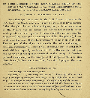 - Erstbeschreibung: Richardson, N. M. (1893): On some members of the instabilella group of the genus Lita (Gelechia, partim), with descriptions of L. suaedella, n. sp., and L. instabilella, Douglas. — The Entomologist's Monthly Magazine 29: 241-248.