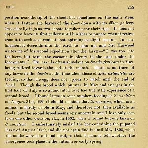 Das entspricht ganz den Ausführungen von Huemer & Karsholt (2010: 131): "The larva has been recorded from Suaeda vera Forssk. ex J. Gmelin and S. maritima (L.) Dumort. (Chenopodiaceae). It feeds in silken galleries on leaves and blossoms, preferably at the tips of the shoots, occasionally on two shoots which are spun together (Richardson 1893: 241). Infested shoots become withered and turn brown. According to Povolný (2002a: 71) the larva is mining. It has been found from May to early June, on S. maritima also in August (Bland et al., 2002: 170), indicating hibernation in the larval stage."