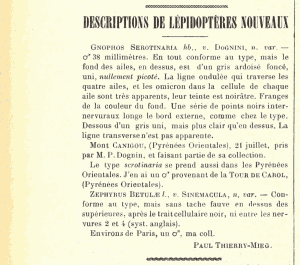 - Beschreibung als Gnophos dognini: Thierry-Mieg, P. (1910): Descriptions de lépidoptères nouveaux. — Le naturaliste 32: 154.