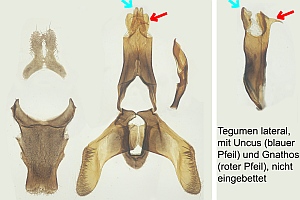 1: ♂, Deutschland, Baden-Württemberg, Königheim, NSG Langenfeld, 370 m, 27. April 2025 (leg. & det.: Maurizio König; conf. durch Genitalpräparation & Mikrofoto: Peter Buchner)Rechtes Einschub-Bild zeigt dasTegumen mit Gnathos und Uncus in lateraler Ansicht, nicht eingebettet. Die spezielle Struktur dieser Bereiche wird bei herkömmlicher, dorsoventraler Einbettung (Bildmitte) unsichtbar