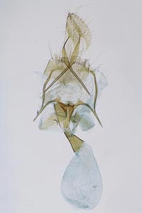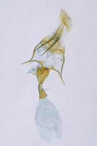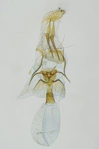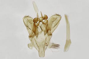 1-2: Genitalpräparat mit Coremata [2] des als Diagnosebild 1 abgebildeten ♂, Deutschland, Baden-Württemberg, 78176 Blumberg, Waldnähe, Südhang mit Gebüschstreifen, Trespen-Halbtrockenrasen auf Kalk, 780 m, am Licht, 11. Juli 2013 (leg., gen. det., präp. & Foto: Hans-Peter Deuring)Forum