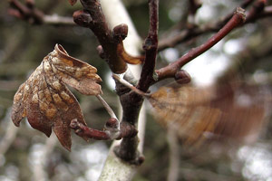 12-16: am Zweig versponnene Blätter mit Hibernacula im Winter, teils baumelnd: Deutschland, Niedersachsen, Region Hannover, Lehrte, Bahnhof, 80 m, an Crataegus monogyna (Eingriffeliger Weißdorn), 9. Februar 2022 / 3. März 2022 (det. & Freilandfotos: Tina Schulz)Forum