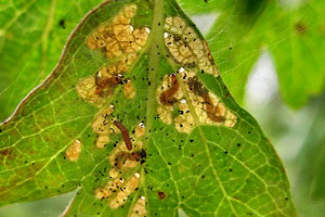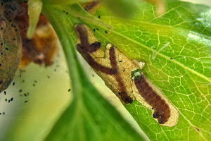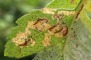 17: Befallsbild direkt nach Überwinterung: Deutschland, Niedersachsen, Region Hannover, Lehrte, Bahnhof, 80 m, leg. Hibernacula in Blättern von Crataegus monogyna (Eingriffeliger Weißdorn) 16. März 2022, gleich in Zimmerwärme genommen, aktiv geworden ab 20. März 2022, Zuchtfoto 24. März 2022 (cult., det. & fot.: Tina Schulz)Forum