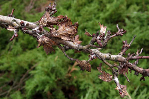 4: Befallsbild an Weißdorn (Crataegus): Deutschland, Nordrhein-Westfalen, Haan, ca. 90 m, 22. Juli 2010 (Foto: Armin Dahl), det. Heidrun MelzerForum