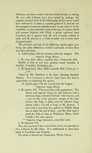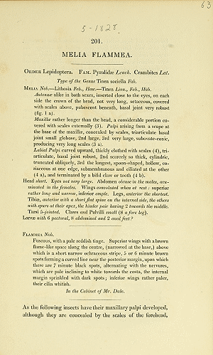 - Erstbeschreibung: Curtis, J. (1823-1840): British Entomology; Being Illustrations and Descriptions of the Genera of Insects Found in Great Britain and Ireland: Containing Coloured Figures from Nature of the Most Rare and Beautiful Species, and in Many Instances of the Plants upon which they are Found. Vol VI. Lepidoptera, Part II. — [Not paginated]. London (E. Ellis & Co.).