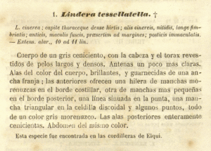 Blanchard (1852: 106) beschrieb seine Lindera tessellatella Blanchard, 1852 in der Kombination mit der Gattung Lindera. Da L. tessellatella als einzige Art der Gattung beschrieben wurde, ist die Artbeschreibung hier identisch mit der Gattungsbeschreibung. Ich kann irgends im Band 7 der "Historia fisica y politica de Chile. Zoología" einen Hinweis darauf finden, dass die Art nicht im genannten Jahr (also 1852) beschrieben wurde, was damit zugleich für die Gattungsbeschreibung Lindera Blanchard, 1852, gilt. Im [Global Lepidoptera Names Index auf nhm.ac.uk] ist die letztere Ziffer der Jahreszahl 1852 durch eine rote handschriftliche "4" ersetzt. Offensichtlich gibt es also Gründe, warum der Band mit dem Schmetterlings-Kapitel erst 1854 erschienen sein könnte - ich kenne sie allerdings nicht. Dies führte dazu, dass Gattung und Art hinsichtlich der Jahre ihrer Erstbeschreibung in manchen Quellen um 2 Jahre auseinandergerissen sind - obwohl es doch nur eine einzige Beschreibung gibt. Ohne konkete Erkenntnisse belassen wir es hier bei 1852.