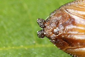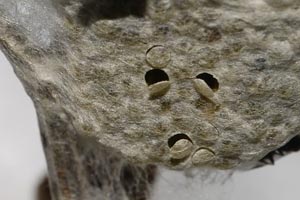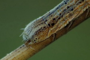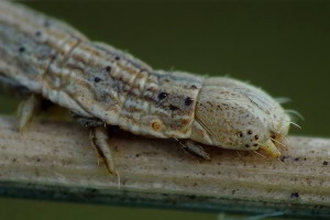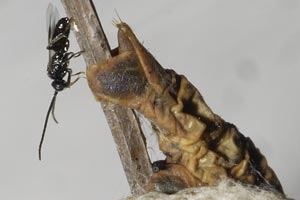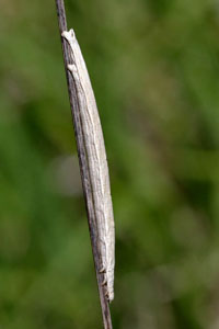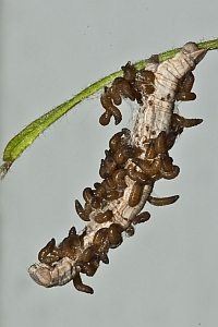 1: Braconidae Larven (Brackwespen) verlassen die Wirtsraupe, Deutschland, Baden-Württemberg, oberer Neckar, kleine Wacholderheide W von Villingendorf bei Rottweil, 695 m, an trockenem Grashalm am 2. Juni 2009 (Studiofoto am 11. Juni 2009: Peter Lacha)Forum