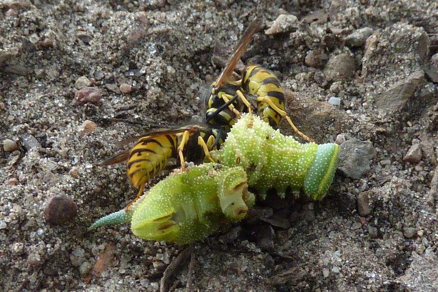 Abendpfauenaugenraupen haben meist blaue Hörner. Es kommen zwar auch gelbgrüne Raupen vor, aber nur selten, noch viel seltener mit roten Flecken. [Anmerkung Wolfgang A. Nässig]