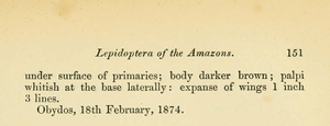 - Erstbeschreibung: Butler, A. G. (1877): On the Lepidoptera of the Amazons, collected by James W. H. Trail, Esq., during the years 1873 to 1875. — The Transactions of the Entomological Society of London for the Year 1877 (2): 105-156, pl. III. — Digitalisat auf biodiversitylibrary.org: [150]