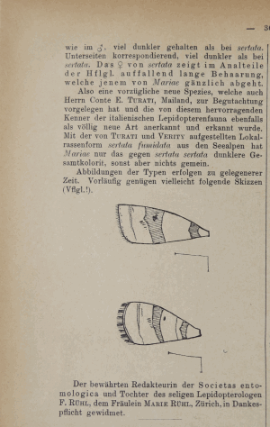 So würde das heute wohl niemand mehr formulieren: "Der bewährten Redakteurin der Societas Entomologica und Tochter des seligen Lepidopterologen F. Rühl, dem Fräulein Marie Rühl, Zürich, in Dankespflicht gewidmet" (Stauder 1921).