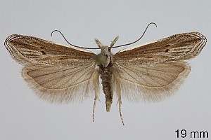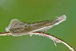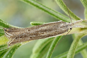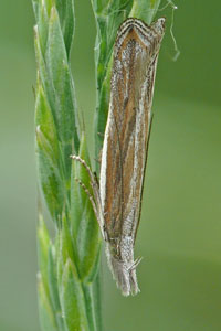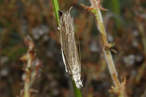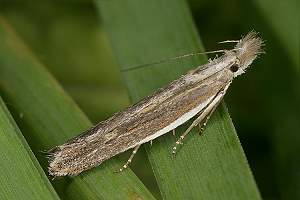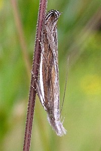 Noch komplizierter wird die Zusammenstellung von Gregersen & Karsholt (2022: 378): "Host-plant. Anthoxanthum odoratum (Benander op. cit.); Poa alpina (Schütze 1931: 90), Sorhagen (1886: 213) and Schütze (1991: 90) wrote that Schmid found the larva in spun webs under Dianthus. Elsner et al. (1999: 49) also list Silene and Artemisia as host-plants." Und jetzt folgen die Angaben zum Verhalten der Raupe: "The larva lives in vertical tubes of basal leaves consuming the sprouting shoots, eating them from the top. Larvae of Crambus Fabricius, 1798 (Crambidae) live in the same way, but consume the leaves from the base up (Benander op. cit.); [...] Larvae found 6.vi. gave adults 24-28.vi. The habitats are dry meadows, pastures and hillsides with low vegetation. [...] The larva is difficult to find and only a few cases od rearing have been reported."