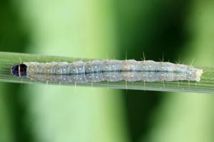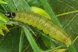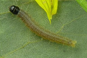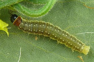 Kennel (1910: 118) berichtete zusammenfassend: "Die Raupe ist grünlichweiß oder grauweiß, die Wärzchen sind weiß oder grau, der Kopf und das fein geteilte Nackenschild sind schwarz oder schwarzbraun. Sie lebt polyphag an Stachys germanica, Asclepias vincetoxicum, Iris foetidissima, Clematis vitalba, Artemisia campestris, Convallaria, Dictamnus albus, Salvia officinalis, Humulus, Pyrus communis, Lysimachia, Plantago, Sedum-arten etc.; besonders auch, manchmal sehr schädlich werdend, an Vitis vinifera. Sie frißt vom September an sowohl die Samen der Pflanzen wie die Blätter, die sie zusammenrollt. Sie überwintert (bei Vitis unter der Rinde), spinnt im Frühling das junge Laub zusammen, frißt das Innere und die Blütenknospen aus und die Triebspitze ab. Die Verpuppung erfolgt im Mai".