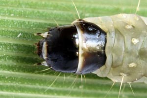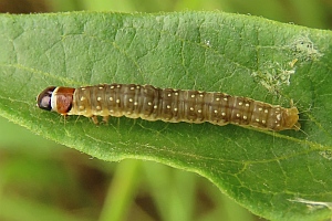 Disqué (1905: 213) berichtete ebenfalls aus der Pfalz: "Bald mehr oder minder häufig und in manchen Jahren am Weinstock schädlich. R. 6 ist polyphag. Ich fand sie noch an Lysimachia und an Sedum telephium. Sie ist heller oder dunkler grün, oder grünlichgrau mit mehr oder minder deutlichen weissen Punkten. Kopf schwarz. Nackenschild trüb orange, mehr oder weniger unten schwarz gerandet. Afterschild braungelblich. Das Nackenschild der jungen R. ist ganz schwarz."