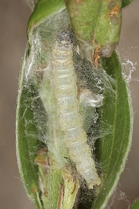 Schütze (1931) fasste erneut zusammen: "In den Samen oder gerollten Blättern polyphag an Stachys germanicus, Cynanchum vincetoxicum, Iris foetidissima, Clematis vitalba, Artemisia campestris, Pirus communis, Polygonatum, Sedum, Lysimachia, Dictamnus, Humulus, Salvia officinalis, Vitis vinifera. Am Weinstock überwintert sie unter der Rinde; im Frühjahr spinnt sie das junge Laub zusammen, frisst das Innere mit den Blattknospen aus und kappt die Triebspitze. Verwandlung zwischen versponnenen Blättern (Sorhagen). Nach Frey soll die Raupe, der „Springwurm“, in manchen Jahren häufig sein und ganze Weinberge verheeren."