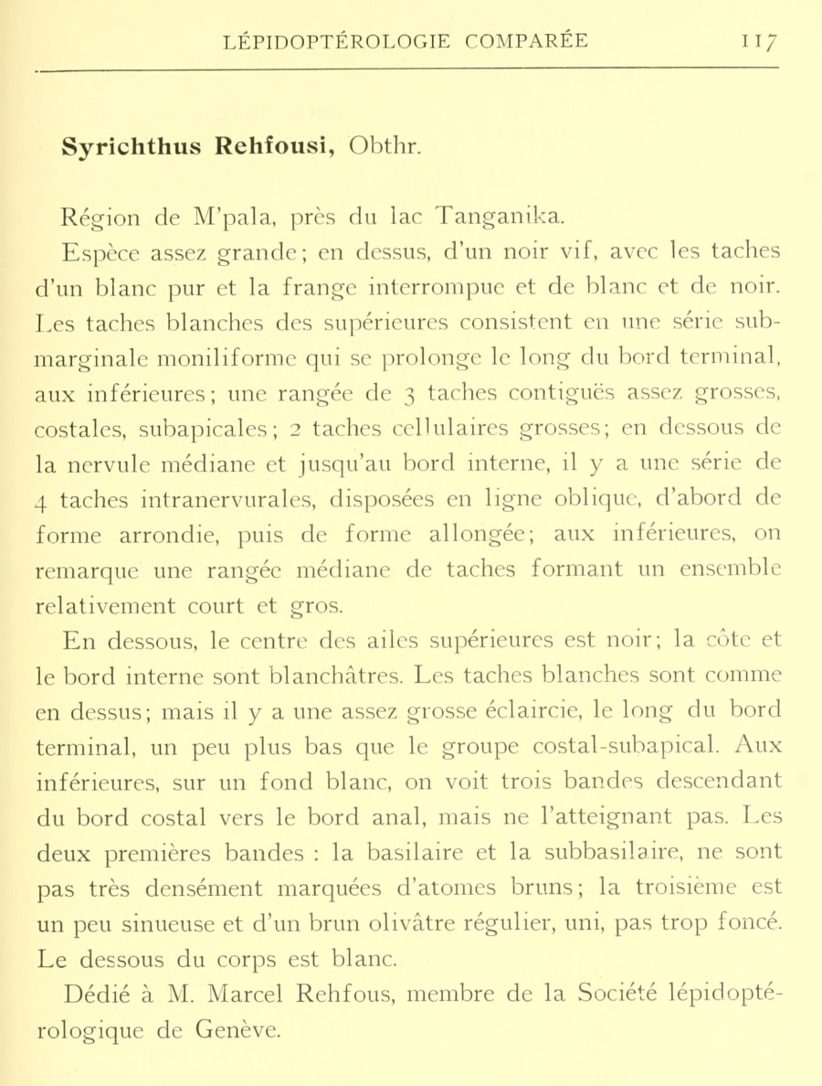 - Beschreibung als Syrichthus rehfousi: Oberthür, C. (1912): Observations sur les Hesperidae du Genre Syrichthus. — Études de lépidoptérologie comparée 6: 47-120, 340-345, pl. CXXXVIII-CXLIII. — Digitalisat auf biodiversitylibrary.org: [117], [345], [pl. CXLIII fig. 1331]