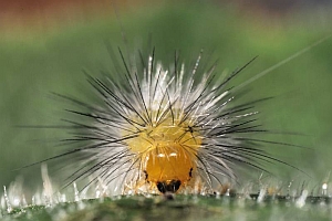 10: ganz kurz nach der Häutung [dieselbe Raupe [eine halbe Stunde später]]: Deutschland, Niedersachsen, Rodenberg, Randbereich eines Regenrückhaltebeckens, 85 m, L1 an Blattunterseite von Cornus sanguinea (Roter Hartriegel), 8. Juli 2015, Foto 3. August 2016 (cult., det. & Zuchtfoto: Tina Schulz)Forum