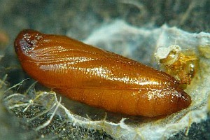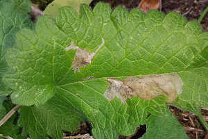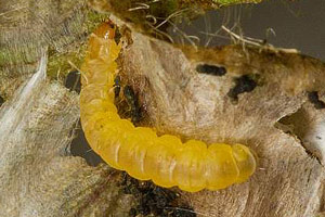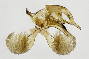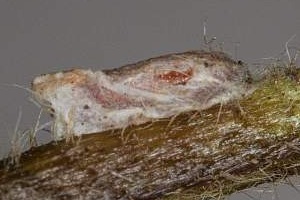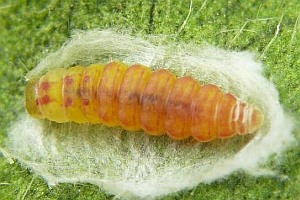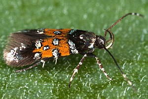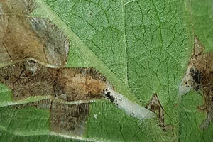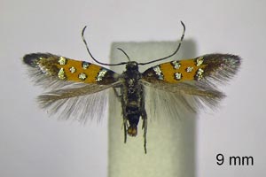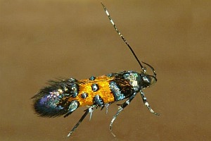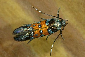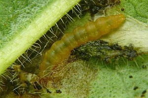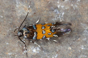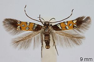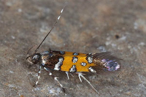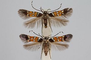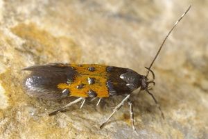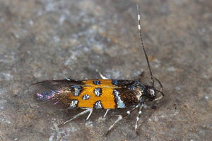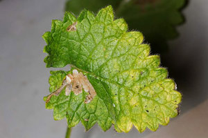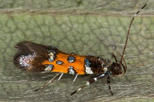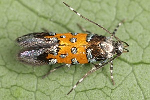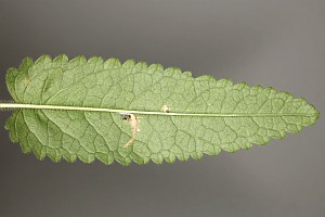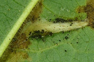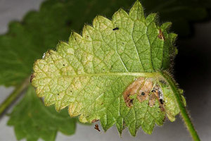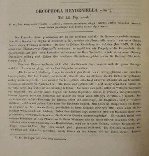 Die Angabe zu Stachys sylvatica (Wald-Ziest) geht auf die Erstbeschreibung zurück. Fischer v. Röslerstamm (1841) kann hier eine erfreulich ausführliche Beschreibung von "Herr Senator von Heyden" aus Frankfurt a.M. zitieren, dem eigentlichen Entdecker der Art; dort heißt es: "„Die kleine sechzehnfüssige Raupe […] Erst völlig erwachsen nimmt sie die rothe Farbe an; früher ist sie einfarbig hellgrün. Sie findet sich nicht selten in waldigen Gegenden um Frankfurt, wo sie von Mitte August bis Anfang September einzeln in grossen, unregelmässigen, braunen Räumen unter der Epidermis der Blätter des Wald-Ziest (Stachys sylvatica L.) minirt. Sie verfertiget sich auf der Unterseite des Blattes, neben der Mittelrippe, ein längliches, flaches, weisses Gehäuse, welches mit seinem Ende unter der Epidermis mündet. Man findet die Raupe selten im Blatte, da sie ausser der Zeit, wo sie frisst, gewöhnlich in ihrem Gehäuse verborgen sitzt, auch wenn sie beunruhigt wird, sich hinein flüchtet. Neben dem Gehäuse liegt äusserlich stets ein Häufchen ihrer ausgeworfenen, schwarzen Excremente, durch etwas Gewebe zusammengehalten. Gewöhnlich findet man mehrere Individuen an einer Pflanze. – In ihrem Wohnorte oder an einem anderen passenden Orte, gewöhnlich unter einem umgeschlagenen Blatttheilchen, wird sie in einem kleinen, weissen Gespinnste zur Puppe. […] Die Motte entwickelt sich Ende Mai und Anfang Juni. Sie ist lebhaft, scheint aber fast lieber zu laufen als zu fliegen.“" Mein Fragezeichen bezüglich des Wald-Ziest beruht darauf, dass ich bei dem exzellenten Beobachter von Heyden auch bei anderen Arten auf "Stachys sylvatica" stoße, die üblicherweise am Heil-Ziest leben. Ich halte es daher für gut möglich, dass ein Heil-Ziest am lichten Waldweg hier fälschlicherweise zum "Wald-Ziest" wurde - vielleicht sollte man nach bald 180 Jahren um Frankfurt doch mal wieder nach der Raupe suchen ...