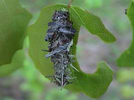 1: Waldinnensaum an einer großen Waldwiese, Deutschland, Rheinland-Pfalz, Ober-Olmer Wald bei Mainz, 12. Mai 2008, Raupensack Bild 4 auf einer der beiden Blüten scharf am linken Bildrand (Aufnahme: Jürgen Rodeland)