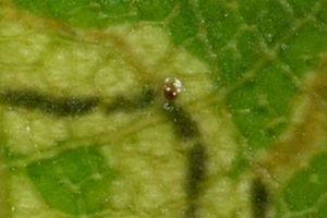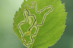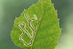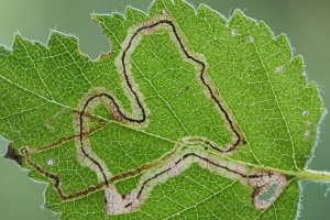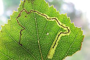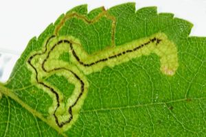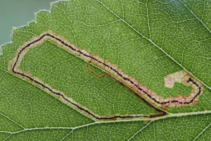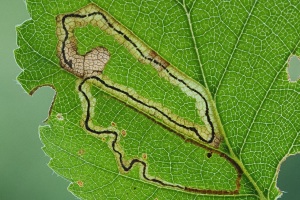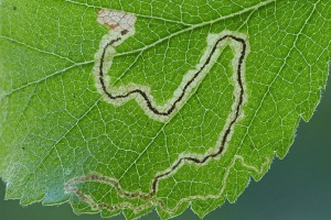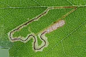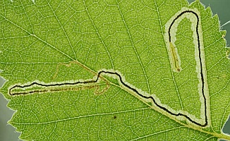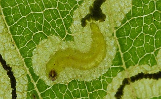 Man erkennt die Mine daran, dass es einen abrupten Wechsel in der Ausprägung der Kotlinie gibt (Bild 2, im Durchlicht) und daran, dass das Ei auf der Blattunterseite abgelegt wird (Bild 3). Text: Josef Bücker