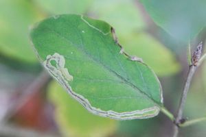 Die Mine verläuft fast unsichtbar von der Blattspitze bis zum Stielansatz. Erst dort erweitert sie sich. Ab diesem Zeitpunkt ist sie am Strauch einigermaßen zu erkennen. (Uwe Büchner)